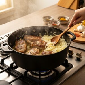 - Heat oil in a large pot over medium heat. Add the meat, onions, garlic, carrots, and celery. Cook until the vegetables are tender, about 10 minutes.